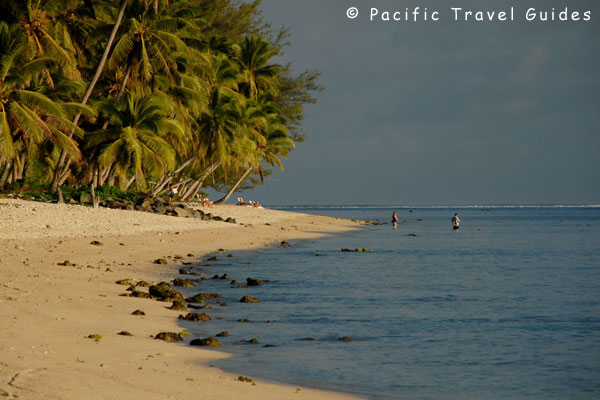 The beachfront lies close to Arorangi Village and is of part coral sand. The lagoon is too rocky for swimming or snorkelling although there are a few sandy bottom "pools" you can lie in.