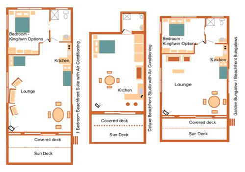 Deluxe Studio rooms have an open plan layout, without a separate bedroom. Furnishings and features are the same as the bungalows & suites. Air-conditioning is available at an extra cost payable direct to Sunhaven on arrival