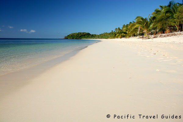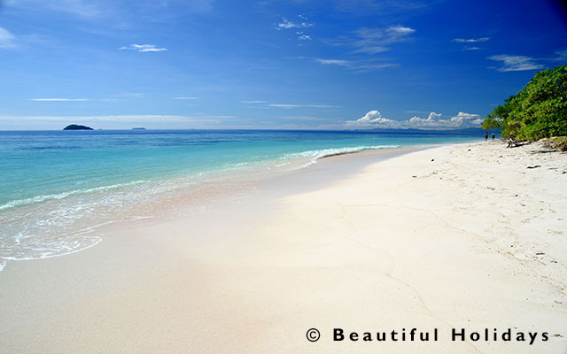 - The Beach: White sand on both sides of island , backed by coconut palms