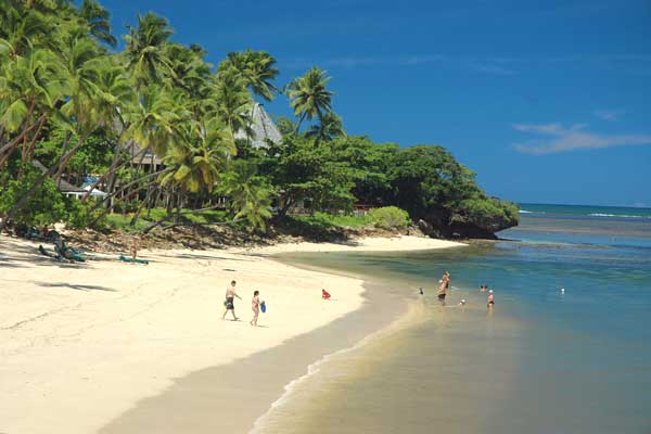 The Shangri-La Fijian Resort, the largest resort in Fiji is aimed primarily at Australian package holiday-makers. Located on a small island connected by bridge to the main Coral Coast highway, the resort stretches along two sides of the island . The Lagoon side is the busiest section with a large family swimming pool, activities centre and has a placid sandy beach good for swimming and snorkelling. The Ocean side has a coarse sand beach and is quieter although not practical for swimming.
