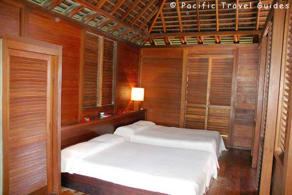 All bungalows offer identical living with a large wooden veranda with writing table and lounge chair, before entering into the open plan bedroom with queen size bed and ceiling fan. Bathrooms are spacious with large shower.