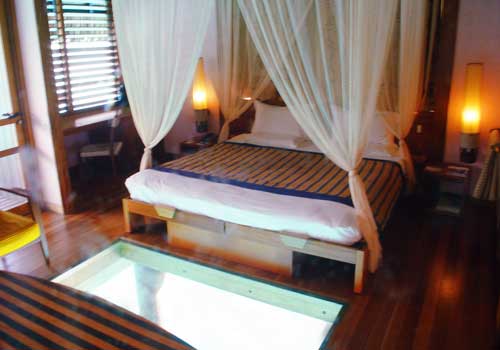 Most beach bungalows are located in coconut groves on the inner lagoon side whilst the eighty plus overwater bungalows extend far out into the main lagoon.