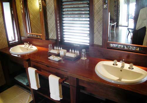 inside bungalowThe nine overwater bungalows offer fine interior design but each one overlooks its neighbour reducing the privacy. The entrance to the overwater bungalows is rather uninviting, facing a brackish lagoon, several dishevelled tin huts lived in by locals and the coastal road.
