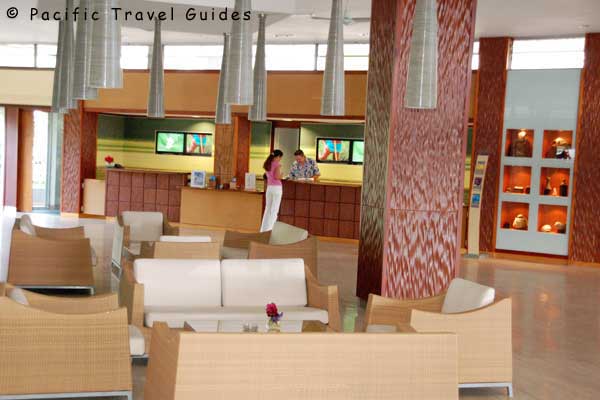 The Sofitel Tahiti Hotel offers modern comfortable rooms alongside a small beach close to the international airport. The uninspiring 60's style hotel façade with its eight storey cement building still exists but interior finishings and a mix of contemporary art and bright Polynesia colours make this a pleasant and affordable stopover.