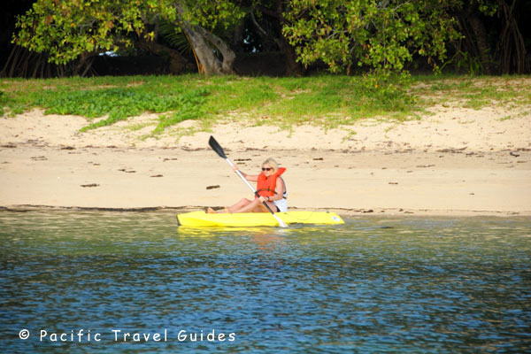 The resort offers enough activities to keep you busy for a short stay including kayaks, snorkelling gear, windsurfing, a small salt water swimming pool, pool table and on site scuba diving operator. The restaurant is atmospheric with wood carvings and other souvenirs and the menu offering at least two choices, usually one meat and one fish vegetarians should put in a special meal request prior to their arrival. The lagoon in front of the resort is good for swimming and has some reasonable snorkelling reefs offshore. For those interested in cultural interaction, the solitary village on Atata is a short walk along the beachfront.